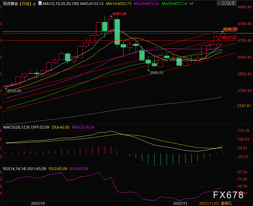 金价周三突破上升通道中轨后,于4239.26关键价位前驻足,目前受此价位以及上升通道上轨压制。