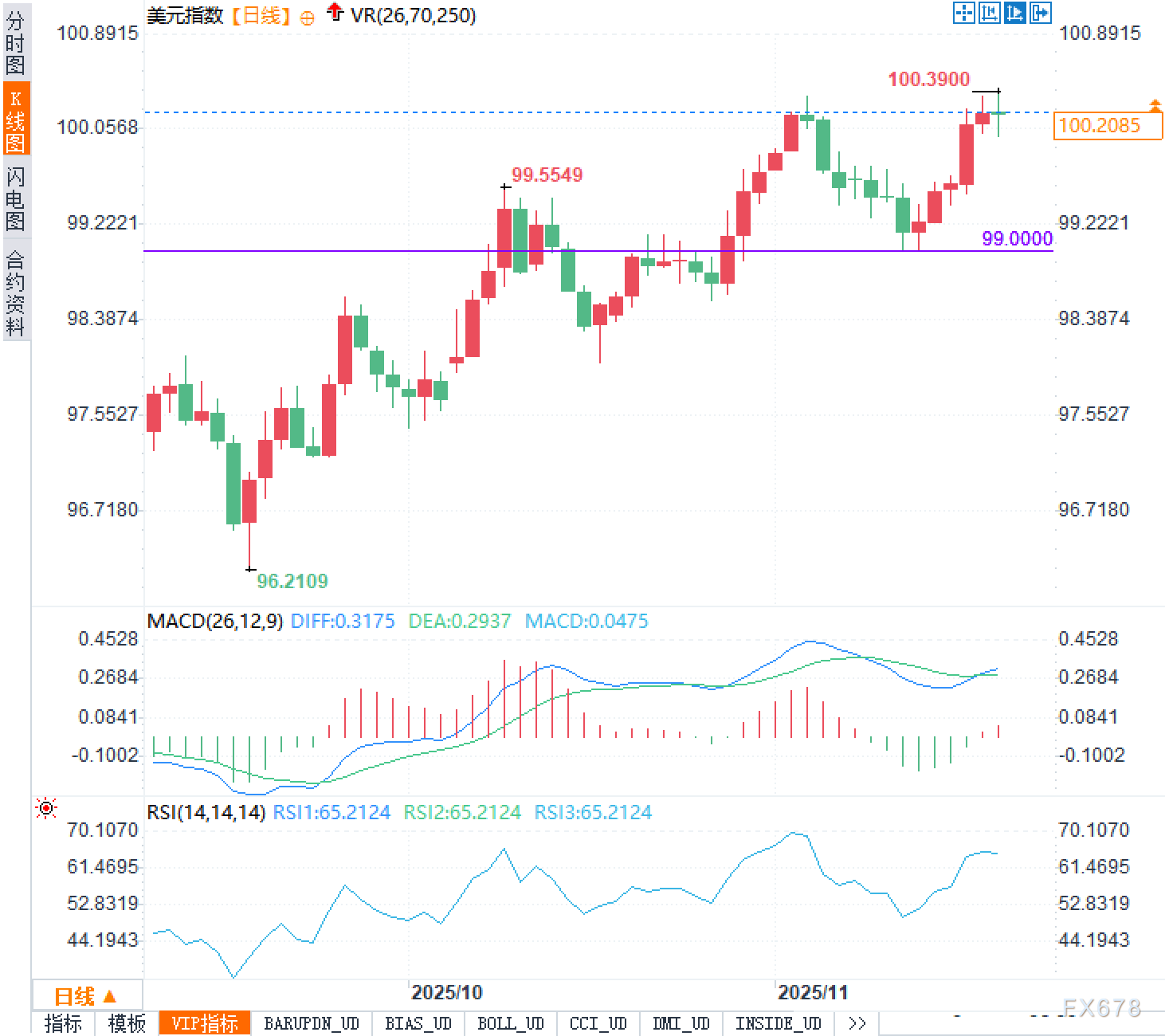 汇通财经APP讯——11月21日,星期五。当前北美时段美元指数交投于100关口之上,市场正处于年末政策预期重构的关键阶段,整体氛围呈现出高度敏感与摇摆不定的特征。美联储在12月是否降息的悬念仍未解开,而近期多位官员释放出相互矛盾的信号,进一步加剧了市场的不确定性。