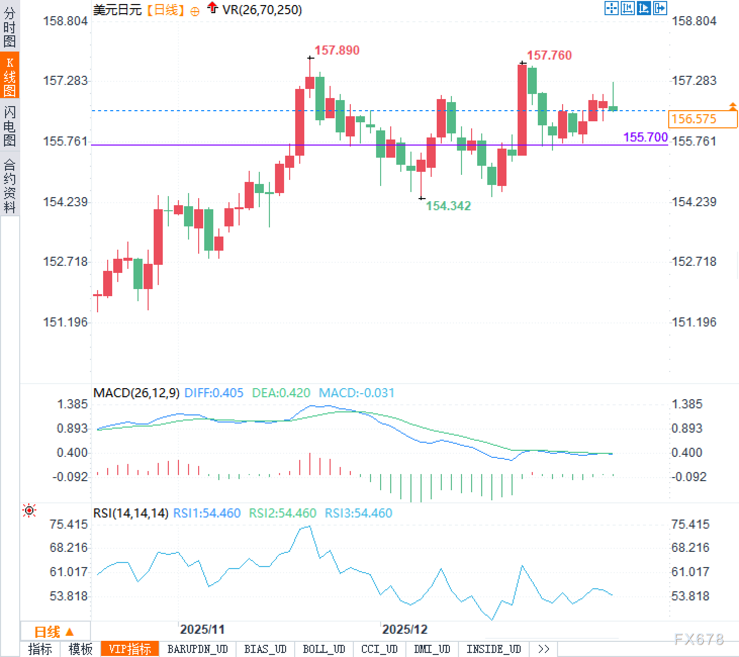 结合日线图形与技术指标,当前价格156.60处在近两个月的震荡带中部偏上位置。前期上方曾出现157.760与157.890附近的阶段高点,意味着上方供给区在高位仍然存在,价格每次靠近该区域都更容易触发短线获利回吐;下方154.342附近对应此前低点,构成更明确的区间下沿参考。图中155.700附近的水平位置在近期多次被市场“看见”,对交易行为的影响更偏向于情绪锚定:当价格围绕该区域上下反复时,市场更倾向用“回归区间中枢”的方式处理噪音,而不是立刻追随趋势扩张。动量方面,MACD接近零轴且柱体略偏弱,反映出趋势动能并不强;RSI在54左右徘徊,说明多空力量更接近平衡,符合“波动存在但方向不坚决”的结构特征。技术面与宏观面在此形成呼应:缺乏单一强驱动时,价格更可能通过更长时间的震荡来消化分歧,而不是快速给出趋势结论。